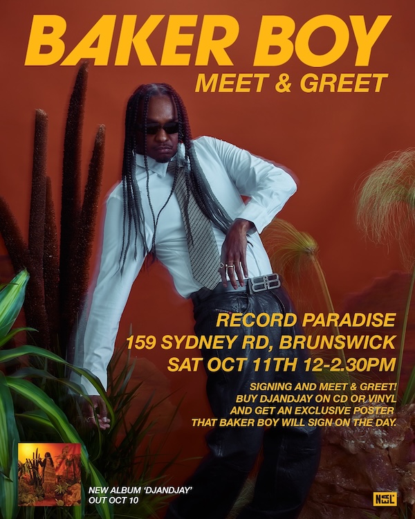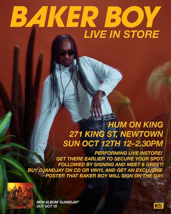 The Fresh Prince of Arnhem Land will meet fans and sign vinyl and exclusive posters. For Sydney, Baker Boy will treat fans to an instore solo performance of songs from his new album.