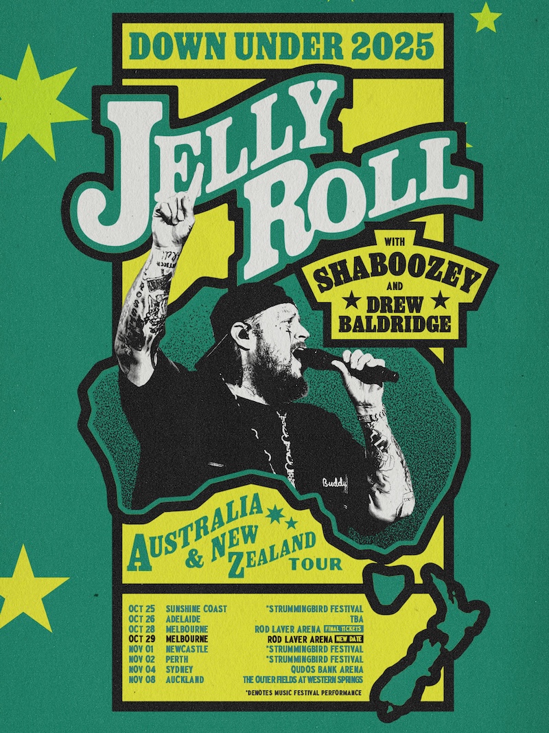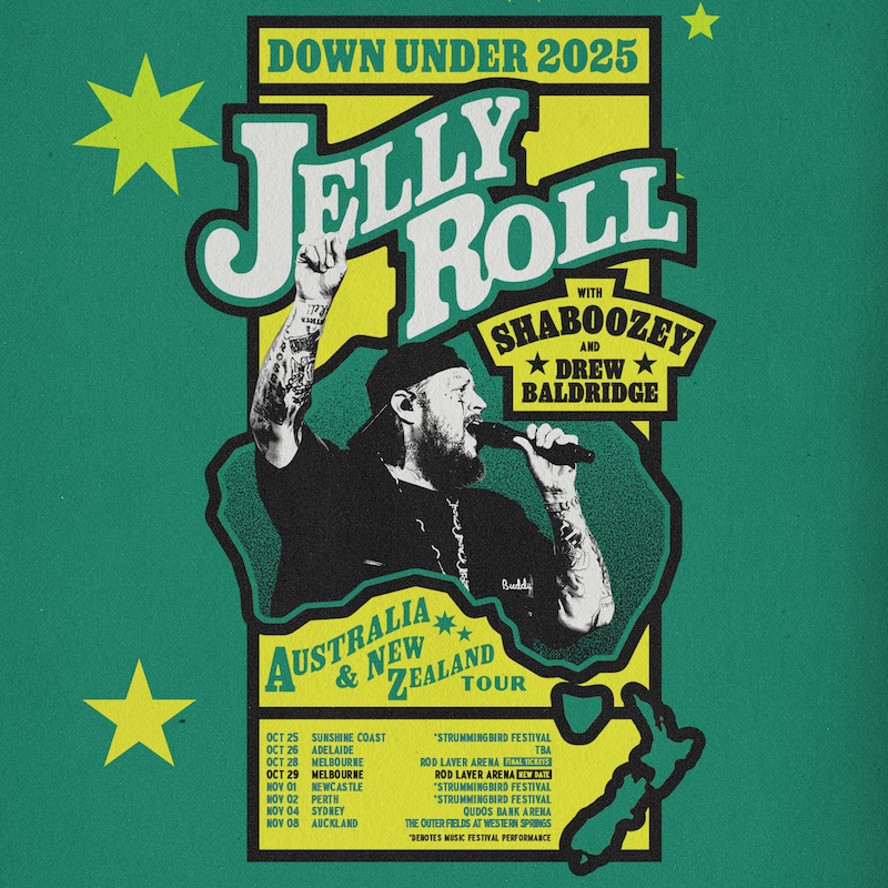 Live Nation is thrilled to announce Grammy nominated, platinum certified, singer songwriter Jelly Roll will make his inaugural visit to Australia and New Zealand this October and November on The Down Under 2025 Tour – and he’s bringing Shaboozey and Drew Baldridge along for the ride.