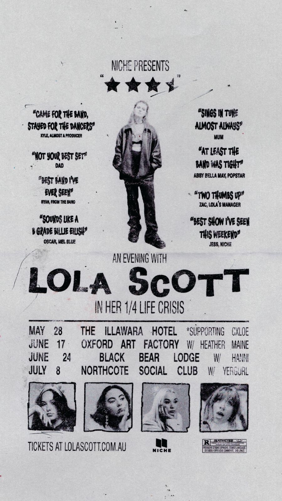 Since the launch of her solo project in 2018, Scott has delivered highly-praised singles with mind-blowing consistency, releasing three hook-laced singles in 2019 including Crowded Conscience, which saw spot plays on triple j, and “Cyclone Weather, which was added to full rotation on tastemaker station FBi Radio in Sydney. Lola launched into 2020 stronger than ever, with fully charged pop track “Take Me Back, which received praise from Purple Sneakers, LeFutureWave, CloutCloutClout, Music Feeds, Indietronica and more.