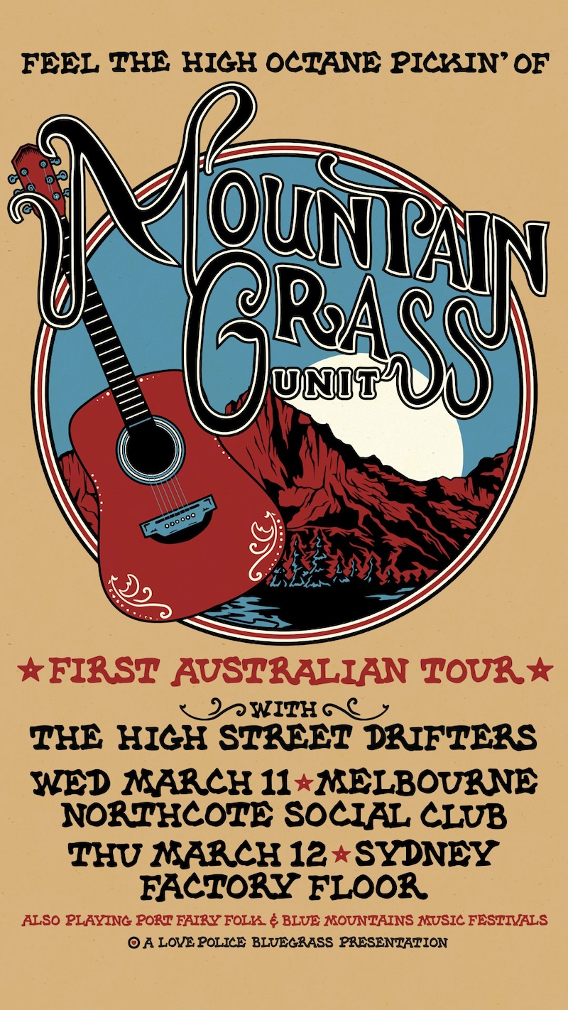 After a breakout year performing at major festivals across the US, Mountain Grass Unit now bring their luminous, high-octane sound to Australian stages and festivals for the very first time. Expect jaw-dropping musicianship, lightning-fast picking, and a whole lotta twang. Joining the band in Melbourne and Sydney will be the High Street Drifters.
