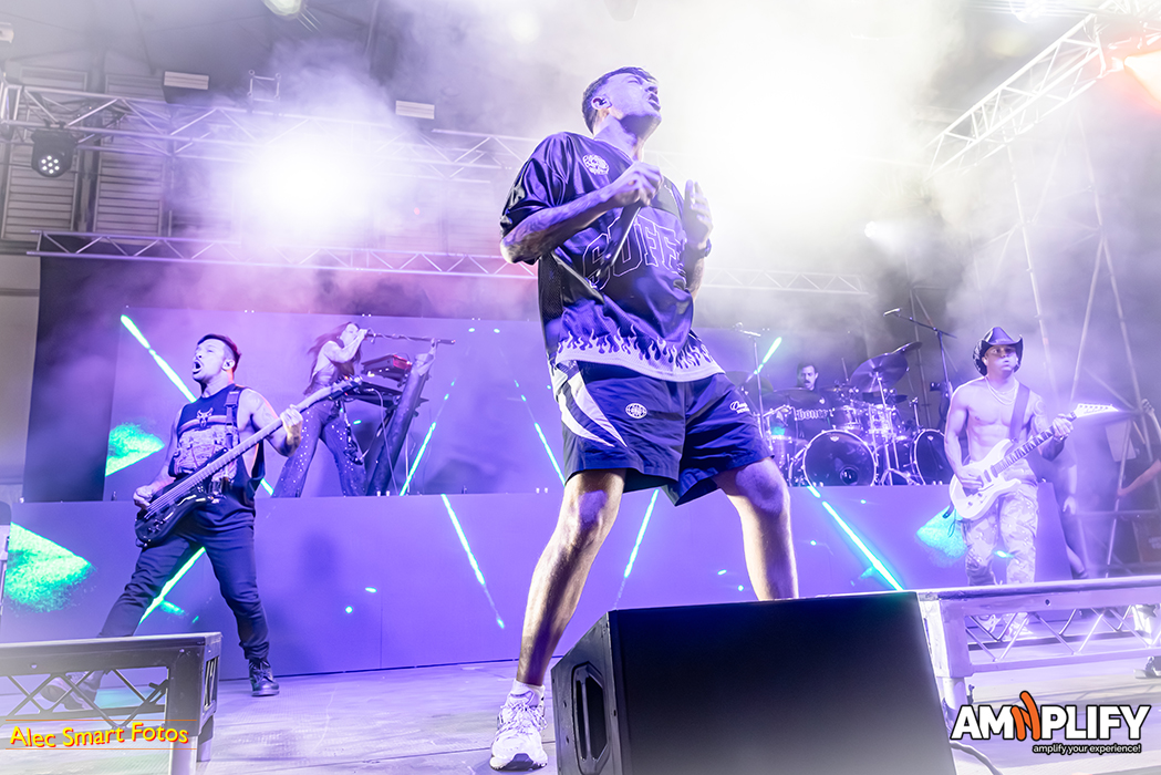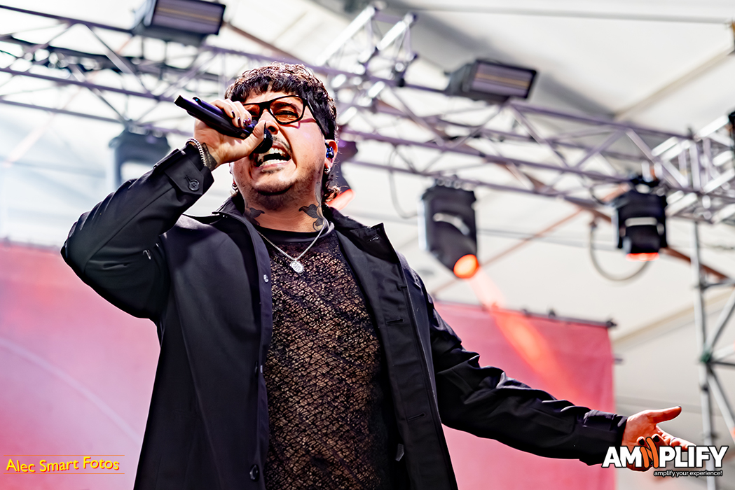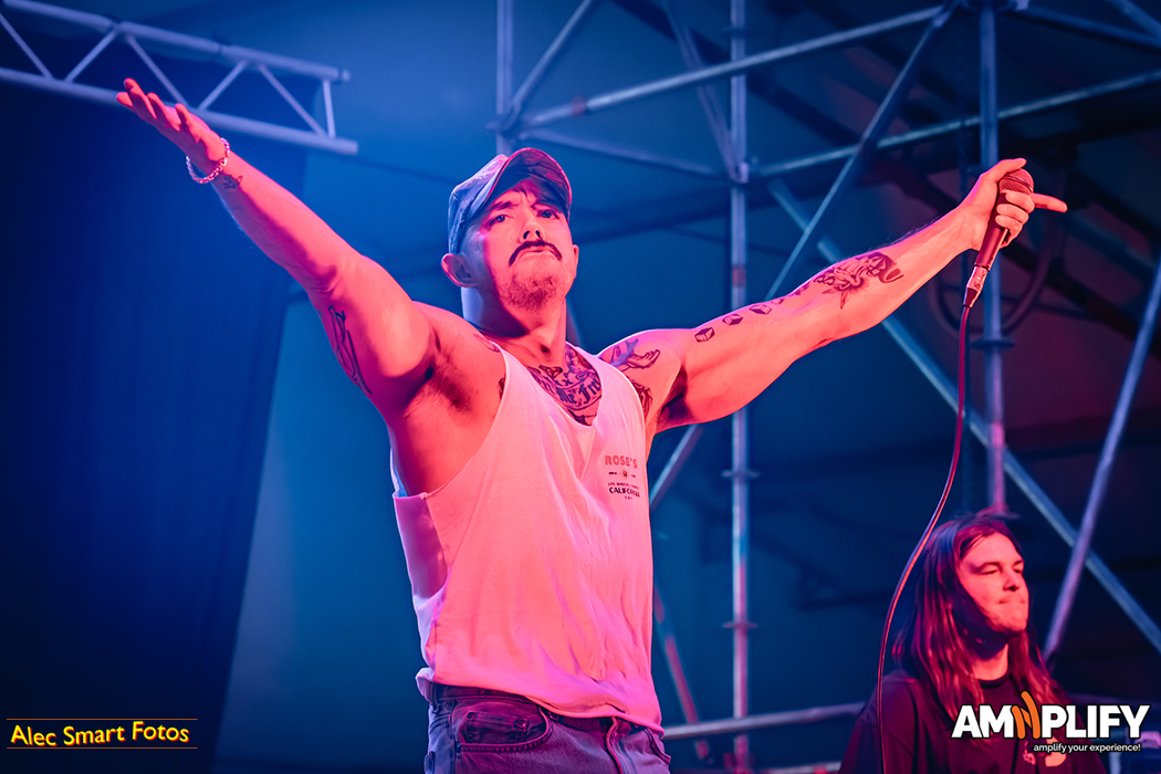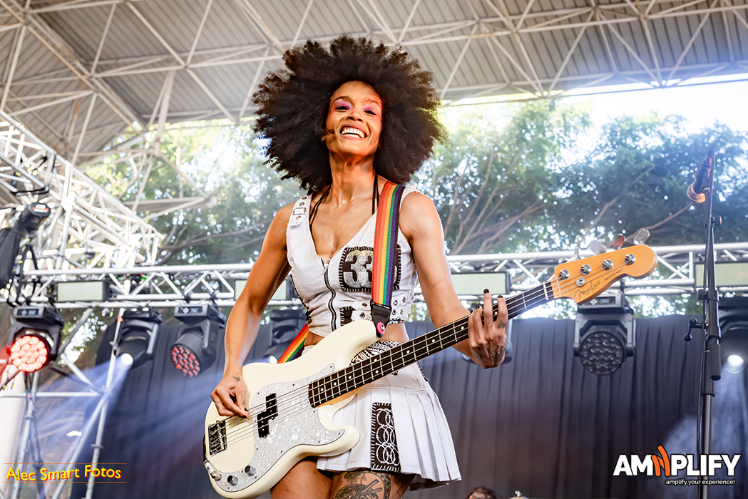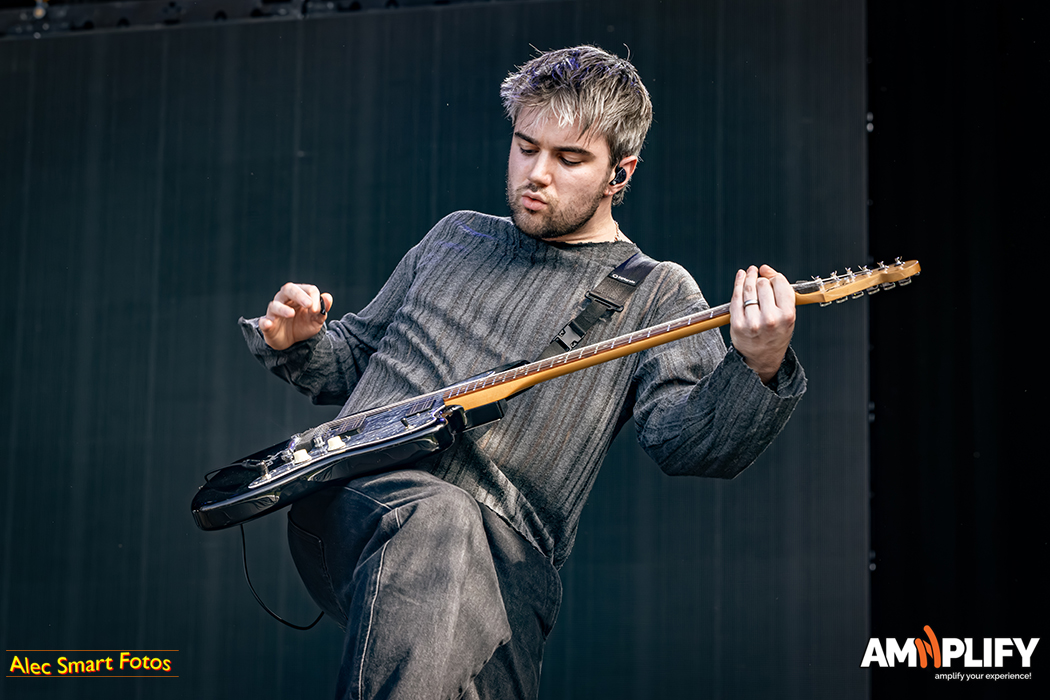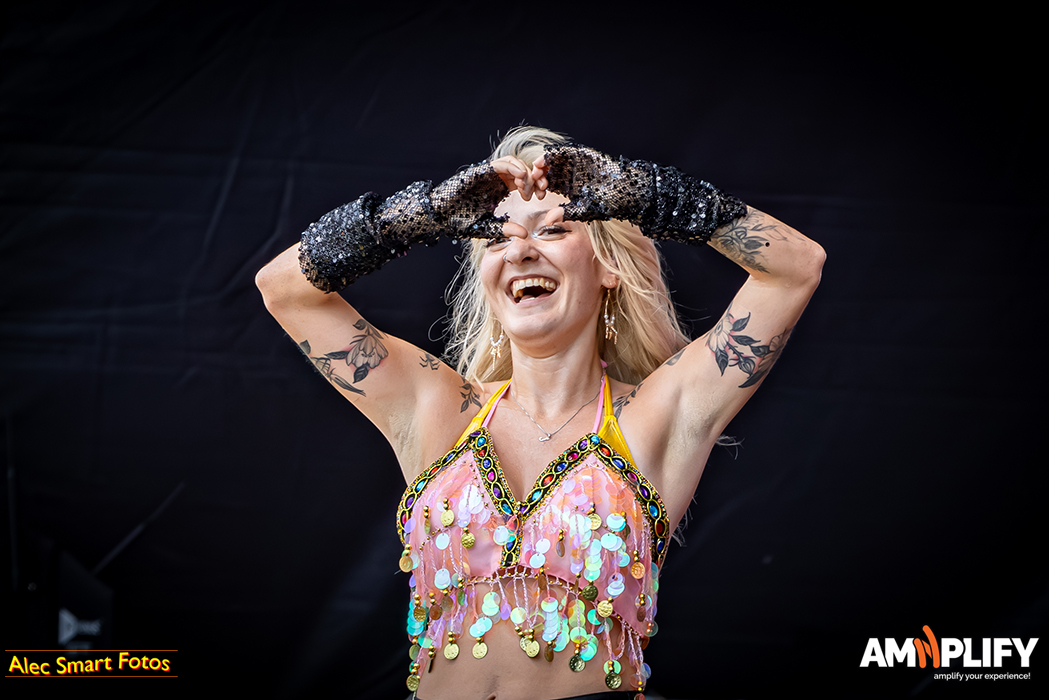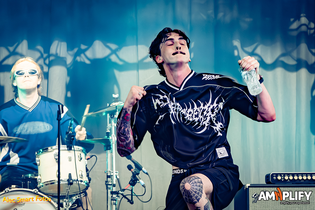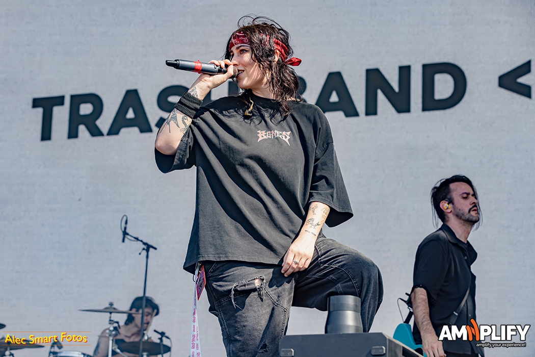 This reviewer photographed 18 of the 31 bands, racing back and forth beneath the burning sun to catch their (management-approved) first three songs, so this write-up focuses on the bands I witnessed. After a long queue to collect media accreditation and pass through the turnstiles, I caught the effervescent Scene Queen (aka Hannah Collins) at her fiery best in the main arena. It’s early in the day, but she’d already inspired a lively moshpit with her pop-metal-rap overlap. She calls it ‘bimbocore’, because it champions women’s sense and sexuality while simultaneously spoofing the stereotype of the blonde, dim-witted women defined only by their looks.
