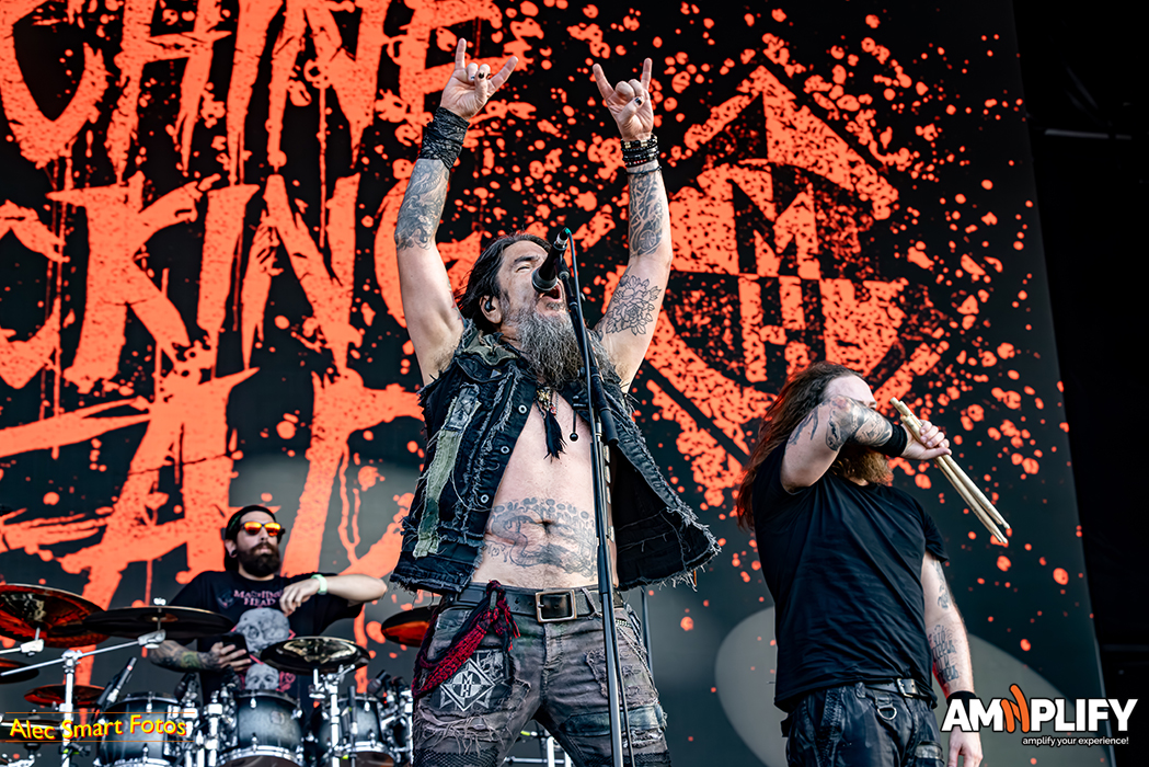 Veteran headbangers Machine Head took to the main stage, fronted by singer-guitarist Robb Flynn. Flynn founded the thrash metal band in 1991 during what the media described at the time as the ‘new wave of American heavy metal’. This era embraced a heavier sound and punkier attitude than traditional metal bands, with growlier vocals and less reliance on guitar solos (often utilising seven string guitars and five string basses tuned down to accentuate deeper notes).