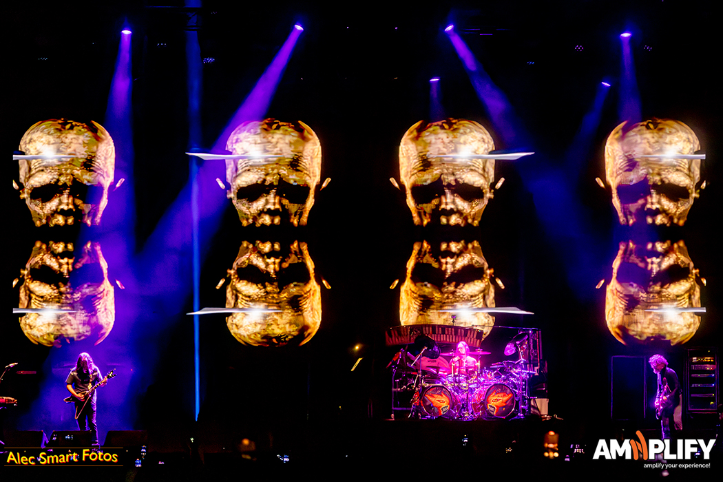 Tool is a multi-media musical phenomenon, elusive, enigmatic and difficult to categorise. Their music could be described as symphonic metal – the complicated compositions are lengthy, heavy and hypnotic. The four-piece performed ten songs in 90 minutes surrounded by large video screens playing surreal and nightmarish animations featuring biomechanical figures, flames, spiritual and religious icons, anatomical examinations, and stop-motion clay-mation.