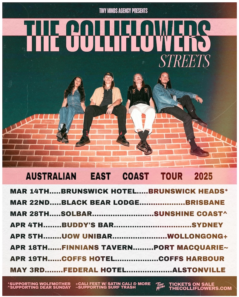 Whether it be from The Colliflowers’ live show, or from their prolific social media presence which has garnered over 2.6 million views on TikTok and over 163,000 streams in the last 12 months on Spotify alone, The Colliflowers are certainly making a name for themselves in the Australian independent music scene. Previous releases from the Byron Bay band have had airtime on national radio, including Triple J and Triple J Unearthed and with ‘Streets’ shaping up to be another massive release, don’t get caught sleeping on The Colliflowers!