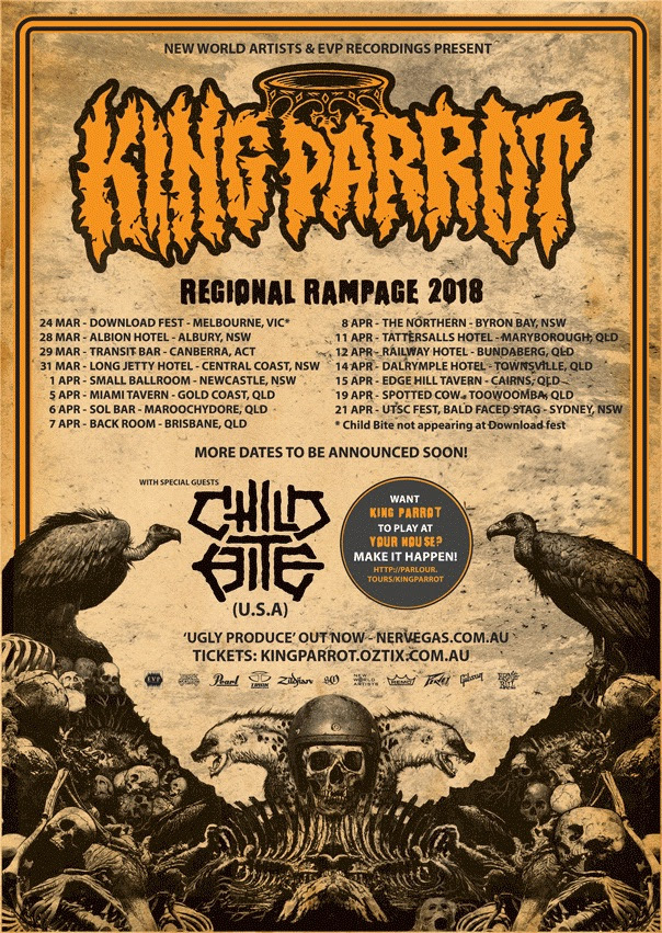 After stomping their way through the nation’s capital cities last December in support of their devastating new album ‘Ugly Produce‘, KING PARROT stay true to their insatiable work ethic announcing a new edition of their ‘Regional Rampage‘ Tour for 2018.